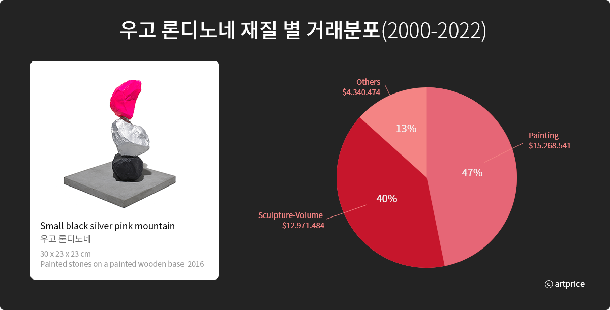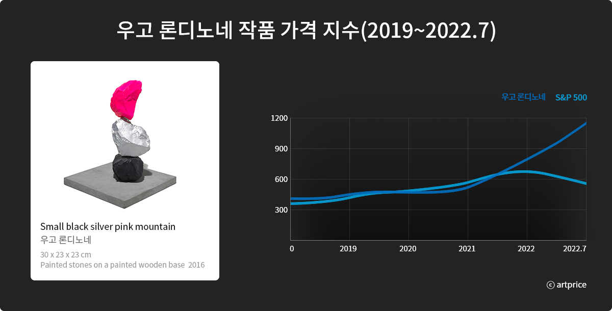 우고 론디노네는 조각, 드로잉, 비디오 등 다양한 매체를 활용하여 자연을 소재로 작품을 만드는 세계 현대미술을 주도하는 작가 중 한 명입니다. 그는 스위스 출신으로 뉴욕을 기반으로 활동하고 있습니다. 18세에 작가가 되기 위해 오스트리아 빈으로 건너가 공부를 하였고, 1980년대 후반 뉴욕으로 이주했으며, 뉴욕에서 작업한 지 얼마 되지 않은 1990년 초부터 이미 미술계의 주요작가로 주목받았습니다. 현재 국제 갤러리, 글래드 스톤, 에스터쉬퍼, 에바 프레센휴버 갤러리 등 전세계 주요 갤러리에 소속 되어있습니다. 그는 다양한 매체를 사용하는 다재다능 한 작가입니다. 회화, 조각, 멀티미디어부터 거대하고 육중한 돌 조각, 무지개 색상의 네온사인까지 한 작가의 작업이라는 것이 믿기지 않을 정도로 다채로운 화법을 시도합니다. 특히 대형 공공미술 프로젝트와 장소 특정적 설치 작업은 보는 이들에게 영감을 주고 있습니다. 우고 론디노네, <Human nature>(2013), 뉴욕 퍼블릭 아트 펀드 주최로 뉴욕 록펠러 센터 광장에 전시된 청성 조각작품 우고 론디노네, <Seven magic mountains>(2016), 미국 라스베가스 네바다 사막, 출처:작가 홈페이지 미국 라스베이거스에 설치된 우고 론디노네의 ‘세븐 매직 마운틴스’ 작품을 감상중인 RM ⓒBTS RM 인스타그램 뉴욕 록펠러 광장의 아홉개의 청석 조각작품<Human nature>(2013)과 그의 가장 대중적인 돌탑 작업 중 하나인 미국 라스베이거스 네바다 사막에 색색의 바위로 만든 일곱 개의 탑 <Seven magic mountains>(2016), 그리고 프랑스 베르사유 정원에 선보인 <The sun>(2017-2018)등 다양한 대형 공공미술 프로젝트를 통해 전세계 다양한 관객들을 만나왔습니다. 국내에서는 2015년에 이어 2022년 국제갤러리의 전시로 대중들을 만나오고 있습니다. 2022년 4월부터 한달 간 진행된 전시는 국제갤러리 서울점과 부산점에서 동시에 오픈하여 국내 관람객들에게 새로운 영감을 선사했습니다. <유의사항> -본 작품은 미술품 보험에 가입되어 있으며, 전문 수장고에 보관되어 파손 및 도난에 대비해 관리되고 있습니다. -본 자료는 과거 미술품 판매 데이터를 기반으로 작성되었으며 다양한 요인에 의해 전망은 달라질 수 있습니다. -본 자료의 기초가 되는 미술품 판매 데이터는 제3자로부터 제공된 것 입니다. -미술품 매각 시기와 매각 가격은 예측할 수 없습니다. -분할소유작품 이미지를 게시, 배포 등 무단으로 사용 시 법적으로 문제 될 수 있습니다. **본 자료는 ARTiPIO 회원들을 대상으로 배포되는 전문자료로 저작권 대상입니다. ARTiPIO의 사전 동의와 출처의 기재 없이 본 자료의 기재 내용 및 데이터 등을 무단으로 전재하거나 재배포 복사할 수 없습니다.